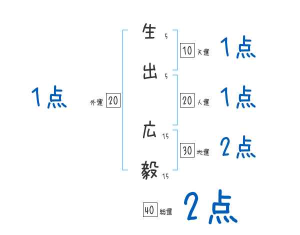 天運![]() | 生出広毅さんの天運は10画の1つ星!不安を感じやすい傾向。ストレスを抱えないように注意しましょう。 家系が持つ宿命的な運勢を表します。祖先から受け継いだ苗字ですので自分の力が及びません。家柄を象徴します。 |