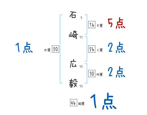 天運![]() | 石崎広毅さんの天運は16画の5つ星!人望が厚く大きく発展する。逆転成功が見える。 家系が持つ宿命的な運勢を表します。祖先から受け継いだ苗字ですので自分の力が及びません。家柄を象徴します。 |
