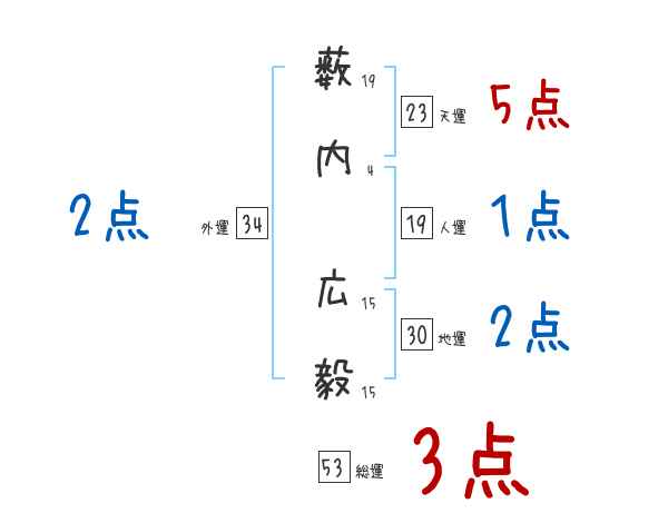 総運![]() | 薮内広毅さんの総運は53画の3つ星!やや見栄っ張りで虚栄心がある。散財に注意。 あなたの人生を表す1番重要な運勢です。生涯を通じて影響する総合運となり、主に50歳以降の晩年期に影響を及ぼします。 |