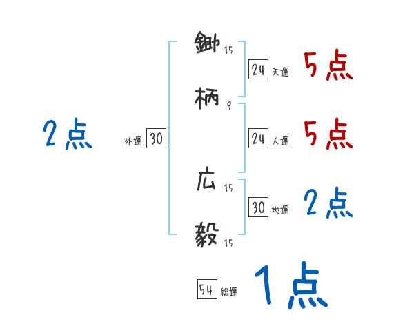 総運![]() | 鋤柄広毅さんの総運は54画の1つ星!トラブルが多いかも。周りをよく見て協調して過ごしましょう。 あなたの人生を表す1番重要な運勢です。生涯を通じて影響する総合運となり、主に50歳以降の晩年期に影響を及ぼします。 |