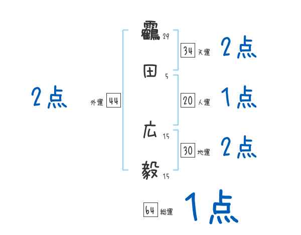 外運![]() | 靏田広毅さんの外運は44画の2つ星!誠実で慎重な性格。物事を考えすぎないように注意しましょう。 生活面を象徴する運勢です。外部から受ける影響力を表し、結婚運、家庭運や職場、環境への順応性を表します。 |