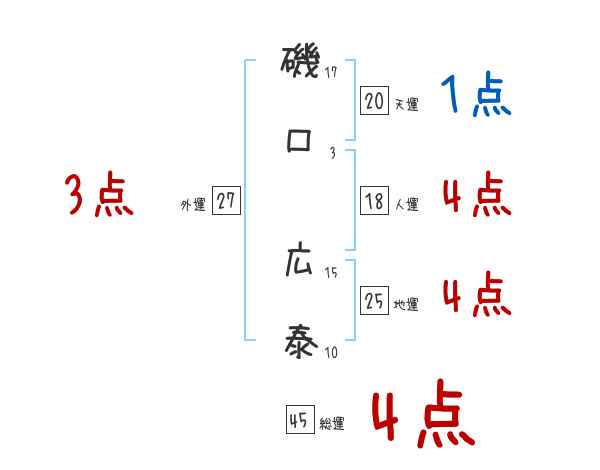 総運![]() | 磯口広泰さんの総運は45画の4つ星!もくもくと物事を進め達成する。地味な努力家。 あなたの人生を表す1番重要な運勢です。生涯を通じて影響する総合運となり、主に50歳以降の晩年期に影響を及ぼします。 |