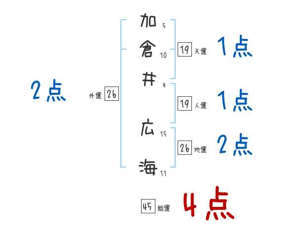 外運![]() | 加倉井広海さんの外運は26画の2つ星!波瀾万丈かも。信頼できる人を大事にしましょう。 生活面を象徴する運勢です。外部から受ける影響力を表し、結婚運、家庭運や職場、環境への順応性を表します。 |