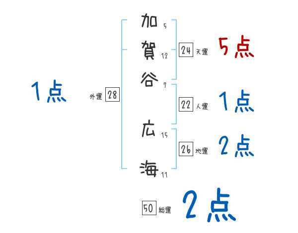 外運![]() | 加賀谷広海さんの外運は28画の1つ星!家庭環境に注意。スポーツで活躍できる能力があるかも。 生活面を象徴する運勢です。外部から受ける影響力を表し、結婚運、家庭運や職場、環境への順応性を表します。 |