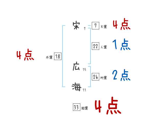 総運![]() | 宋広海さんの総運は33画の4つ星!権力志向でプライドが高い。勇気があり運を切り開き成功する。 あなたの人生を表す1番重要な運勢です。生涯を通じて影響する総合運となり、主に50歳以降の晩年期に影響を及ぼします。 |
