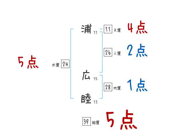 外運![]() | 浦広睦さんの外運は24画の5つ星!家庭運が良く順調な人生。金運にも恵まれる。 生活面を象徴する運勢です。外部から受ける影響力を表し、結婚運、家庭運や職場、環境への順応性を表します。 |