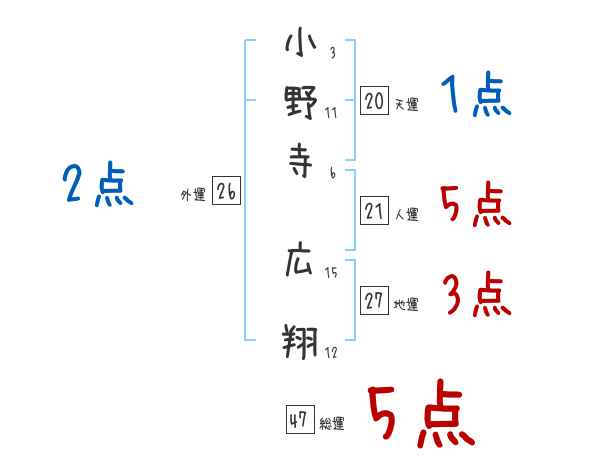 総運![]() | 小野寺広翔さんの総運は47画の5つ星!実力が開花し発展する円満な人生。財に恵まれる。 あなたの人生を表す1番重要な運勢です。生涯を通じて影響する総合運となり、主に50歳以降の晩年期に影響を及ぼします。 |