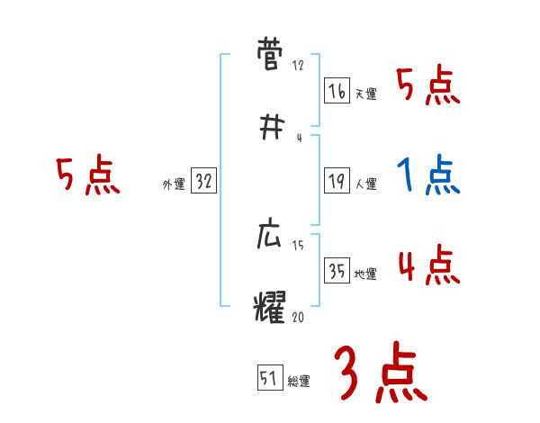 外運![]() | 菅井広耀さんの外運は32画の5つ星!柔軟性があり成功する。チャンスが多く金運が良い。 生活面を象徴する運勢です。外部から受ける影響力を表し、結婚運、家庭運や職場、環境への順応性を表します。 |
