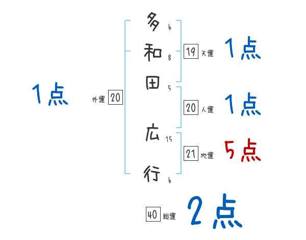 天運![]() | 多和田広行さんの天運は19画の1つ星!優れた才能を持ちますが、協調性が足りないことも。周りの人と協力する事を意識しましょう。 家系が持つ宿命的な運勢を表します。祖先から受け継いだ苗字ですので自分の力が及びません。家柄を象徴します。 |