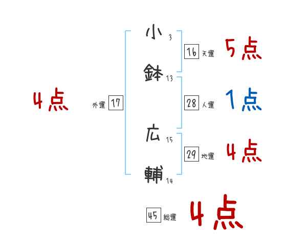 外運![]() | 小鉢広輔さんの外運は17画の4つ星!積極的な行動力。地位を気づき財産を手に入れる。純粋な心と直感力。 生活面を象徴する運勢です。外部から受ける影響力を表し、結婚運、家庭運や職場、環境への順応性を表します。 |