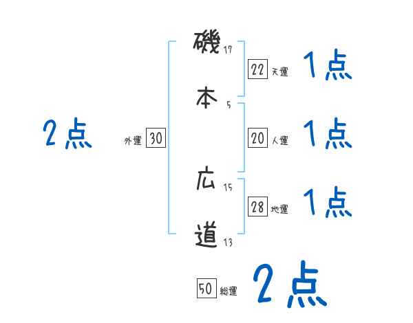 外運![]() | 磯本広道さんの外運は30画の2つ星!浮き沈みの激しさに注意しましょう。 生活面を象徴する運勢です。外部から受ける影響力を表し、結婚運、家庭運や職場、環境への順応性を表します。 |