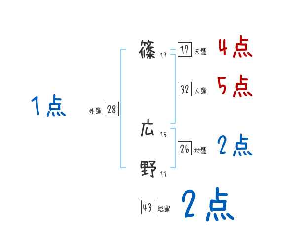 天運![]() | 篠広野さんの天運は17画の4つ星!積極的な行動力。地位を気づき財産を手に入れる。純粋な心と直感力。 家系が持つ宿命的な運勢を表します。祖先から受け継いだ苗字ですので自分の力が及びません。家柄を象徴します。 |