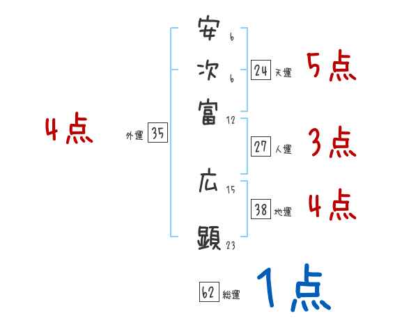 天運![]() | 安次富広顕さんの天運は24画の5つ星!家庭運が良く順調な人生。金運にも恵まれる。 家系が持つ宿命的な運勢を表します。祖先から受け継いだ苗字ですので自分の力が及びません。家柄を象徴します。 |