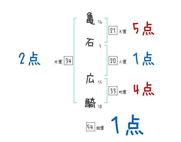 天運![]() | 亀石広騎さんの天運は21画の5つ星!統率力がある。独立し成功する。名誉を手に入れる。 家系が持つ宿命的な運勢を表します。祖先から受け継いだ苗字ですので自分の力が及びません。家柄を象徴します。 |
