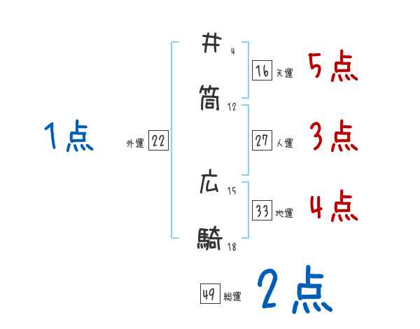 天運![]() | 井筒広騎さんの天運は16画の5つ星!人望が厚く大きく発展する。逆転成功が見える。 家系が持つ宿命的な運勢を表します。祖先から受け継いだ苗字ですので自分の力が及びません。家柄を象徴します。 |