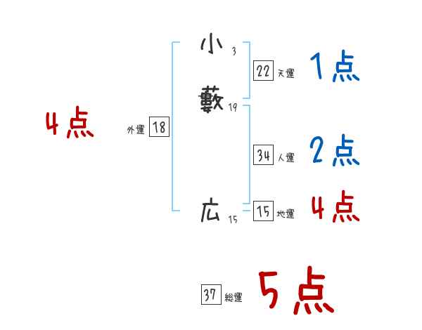 天運![]() | 小藪広さんの天運は22画の1つ星!努力することが苦手ないっぽう手先が器用。芸術性にも優れる。 家系が持つ宿命的な運勢を表します。祖先から受け継いだ苗字ですので自分の力が及びません。家柄を象徴します。 |