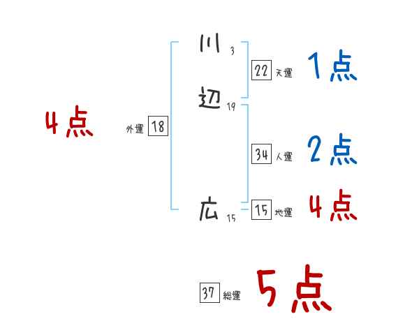 天運![]() | 川辺広さんの天運は22画の1つ星!努力することが苦手ないっぽう手先が器用。芸術性にも優れる。 家系が持つ宿命的な運勢を表します。祖先から受け継いだ苗字ですので自分の力が及びません。家柄を象徴します。 |