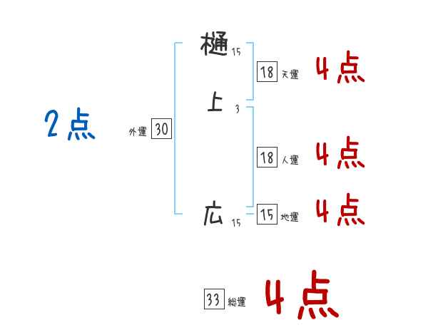 天運![]() | 樋上広さんの天運は18画の4つ星!情熱的で剛気。忍耐力があり信頼される。 家系が持つ宿命的な運勢を表します。祖先から受け継いだ苗字ですので自分の力が及びません。家柄を象徴します。 |