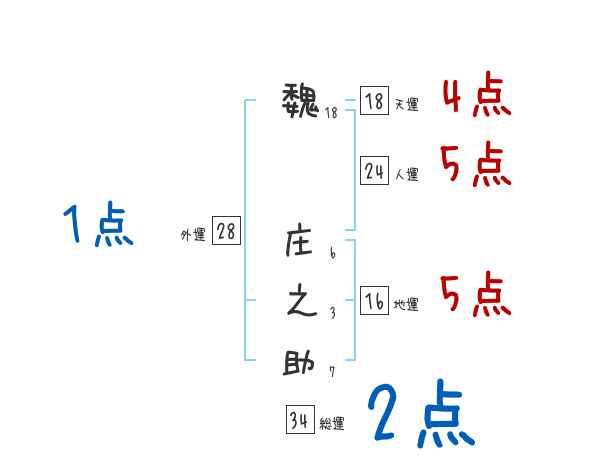 総運![]() | 魏庄之助さんの総運は34画の2つ星!独創性に優れるが、自尊心が強く災難に注意しましょう。 あなたの人生を表す1番重要な運勢です。生涯を通じて影響する総合運となり、主に50歳以降の晩年期に影響を及ぼします。 |