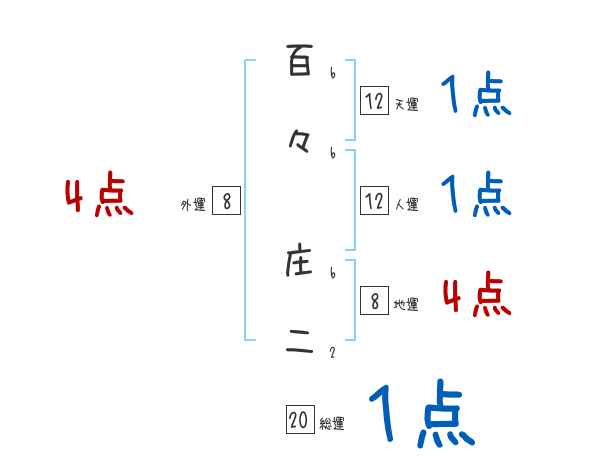 天運![]() | 百々庄二さんの天運は12画の1つ星!簡単な失敗で諦めてしまいやすいかも。着実に行動すると良いでしょう。 家系が持つ宿命的な運勢を表します。祖先から受け継いだ苗字ですので自分の力が及びません。家柄を象徴します。 |
