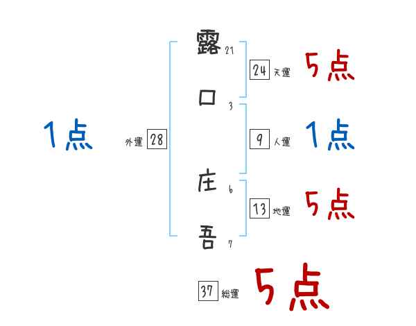 天運![]() | 露口庄吾さんの天運は24画の5つ星!家庭運が良く順調な人生。金運にも恵まれる。 家系が持つ宿命的な運勢を表します。祖先から受け継いだ苗字ですので自分の力が及びません。家柄を象徴します。 |