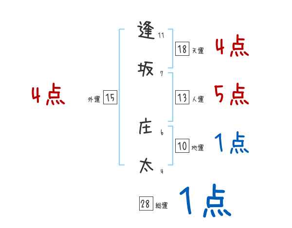 天運![]() | 逢坂庄太さんの天運は18画の4つ星!情熱的で剛気。忍耐力があり信頼される。 家系が持つ宿命的な運勢を表します。祖先から受け継いだ苗字ですので自分の力が及びません。家柄を象徴します。 |