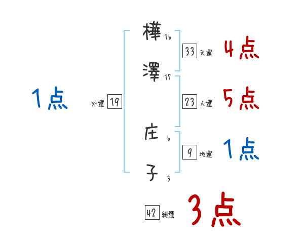天運![]() | 樺澤庄子さんの天運は33画の4つ星!権力志向でプライドが高い。勇気があり運を切り開き成功する。 家系が持つ宿命的な運勢を表します。祖先から受け継いだ苗字ですので自分の力が及びません。家柄を象徴します。 |