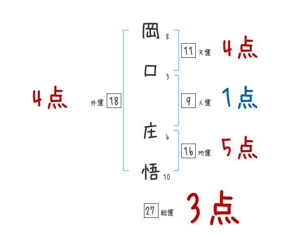 外運![]() | 岡口庄悟さんの外運は18画の4つ星!情熱的で剛気。忍耐力があり信頼される。 生活面を象徴する運勢です。外部から受ける影響力を表し、結婚運、家庭運や職場、環境への順応性を表します。 |