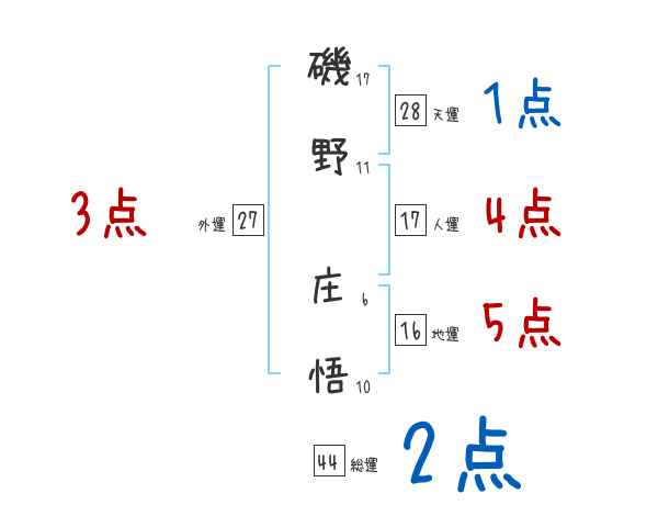 天運![]() | 磯野庄悟さんの天運は28画の1つ星!家庭環境に注意。スポーツで活躍できる能力があるかも。 家系が持つ宿命的な運勢を表します。祖先から受け継いだ苗字ですので自分の力が及びません。家柄を象徴します。 |