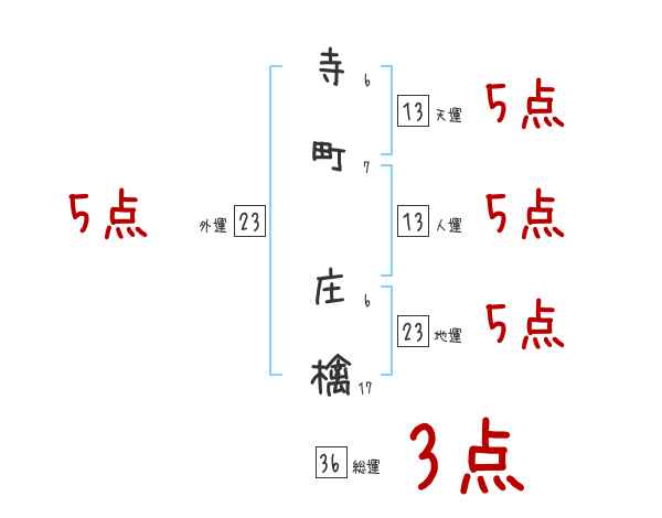 総運![]() | 寺町庄檎さんの総運は36画の3つ星!先見性が豊かです。多少神経質で苦労することも。 あなたの人生を表す1番重要な運勢です。生涯を通じて影響する総合運となり、主に50歳以降の晩年期に影響を及ぼします。 |