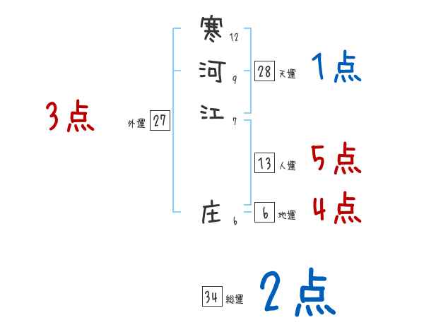 天運![]() | 寒河江庄さんの天運は28画の1つ星!家庭環境に注意。スポーツで活躍できる能力があるかも。 家系が持つ宿命的な運勢を表します。祖先から受け継いだ苗字ですので自分の力が及びません。家柄を象徴します。 |
