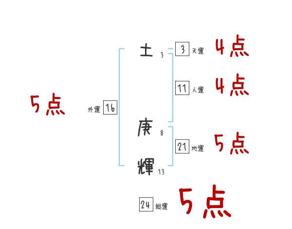 天運![]() | 土庚輝さんの天運は3画の4つ星!活動的で才能に恵まれ、多くの信頼を得る。希望に満ち成長する。 家系が持つ宿命的な運勢を表します。祖先から受け継いだ苗字ですので自分の力が及びません。家柄を象徴します。 |