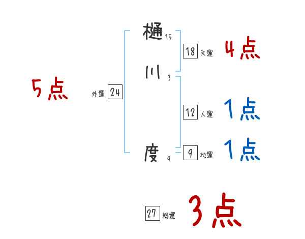 外運![]() | 樋川度さんの外運は24画の5つ星!家庭運が良く順調な人生。金運にも恵まれる。 生活面を象徴する運勢です。外部から受ける影響力を表し、結婚運、家庭運や職場、環境への順応性を表します。 |