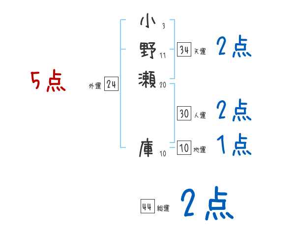 天運![]() | 小野瀬庫さんの天運は34画の2つ星!独創性に優れるが、自尊心が強く災難に注意しましょう。 家系が持つ宿命的な運勢を表します。祖先から受け継いだ苗字ですので自分の力が及びません。家柄を象徴します。 |