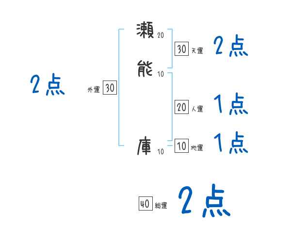天運![]() | 瀬能庫さんの天運は30画の2つ星!浮き沈みの激しさに注意しましょう。 家系が持つ宿命的な運勢を表します。祖先から受け継いだ苗字ですので自分の力が及びません。家柄を象徴します。 |