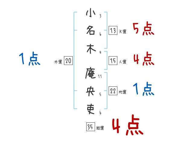 天運![]() | 小名木庵央吏さんの天運は13画の5つ星!才能に恵まれ人気がある。名声を手に入れる。円満な人生。 家系が持つ宿命的な運勢を表します。祖先から受け継いだ苗字ですので自分の力が及びません。家柄を象徴します。 |