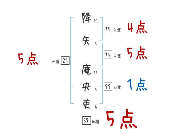 天運![]() | 降矢庵央吏さんの天運は15画の4つ星!人徳があり出世する。順調に物事を進め円満な人生。 家系が持つ宿命的な運勢を表します。祖先から受け継いだ苗字ですので自分の力が及びません。家柄を象徴します。 |