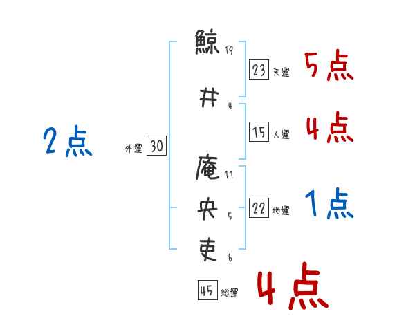 天運![]() | 鯨井庵央吏さんの天運は23画の5つ星!想像力に優れ活力がある。一代で成功し名誉を手に入れる。 家系が持つ宿命的な運勢を表します。祖先から受け継いだ苗字ですので自分の力が及びません。家柄を象徴します。 |