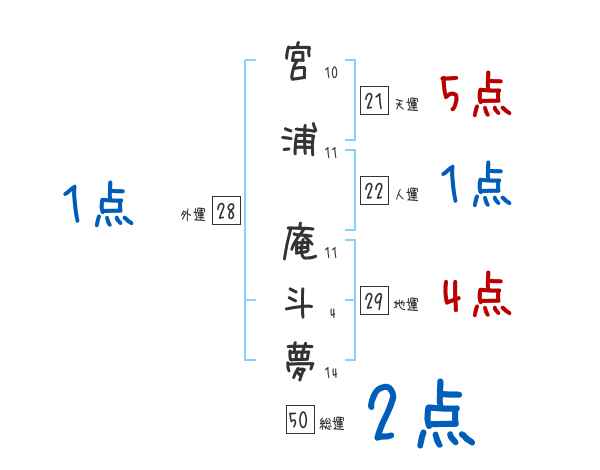 外運![]() | 宮浦庵斗夢さんの外運は28画の1つ星!家庭環境に注意。スポーツで活躍できる能力があるかも。 生活面を象徴する運勢です。外部から受ける影響力を表し、結婚運、家庭運や職場、環境への順応性を表します。 |