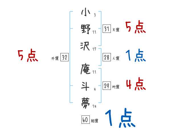 外運![]() | 小野沢庵斗夢さんの外運は32画の5つ星!柔軟性があり成功する。チャンスが多く金運が良い。 生活面を象徴する運勢です。外部から受ける影響力を表し、結婚運、家庭運や職場、環境への順応性を表します。 |
