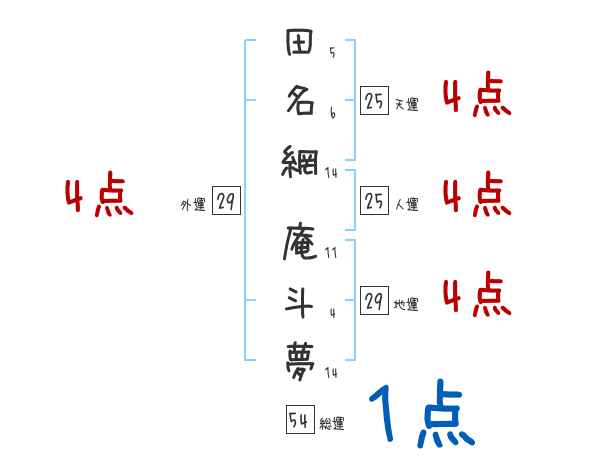天運![]() | 田名網庵斗夢さんの天運は25画の4つ星!個性があり才能があふれる。強運の持ち主で発展する。 家系が持つ宿命的な運勢を表します。祖先から受け継いだ苗字ですので自分の力が及びません。家柄を象徴します。 |