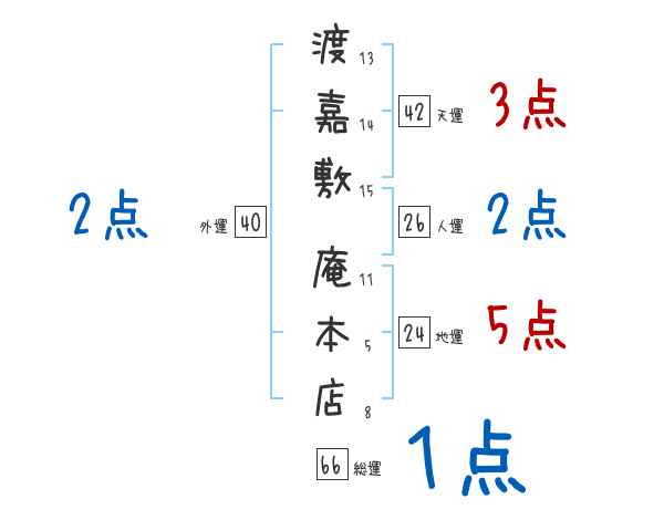 外運![]() | 渡嘉敷庵本店さんの外運は40画の2つ星!自信過剰で物事に固執するためトラブルに注意。 生活面を象徴する運勢です。外部から受ける影響力を表し、結婚運、家庭運や職場、環境への順応性を表します。 |