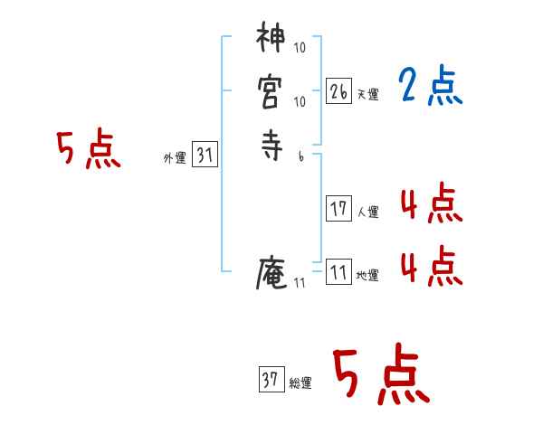 総運![]() | 神宮寺庵さんの総運は37画の5つ星!努力家で順応性に優れる。現実的な考え方ができ忠実に物事をこなす。 あなたの人生を表す1番重要な運勢です。生涯を通じて影響する総合運となり、主に50歳以降の晩年期に影響を及ぼします。 |