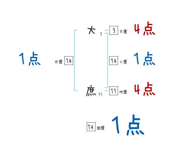 外運![]() | 大庶さんの外運は14画の1つ星!人に対して優しいがストレスを溜め込みがち。人間関係のトラブルを避けるよう気をつけましょう。 生活面を象徴する運勢です。外部から受ける影響力を表し、結婚運、家庭運や職場、環境への順応性を表します。 |