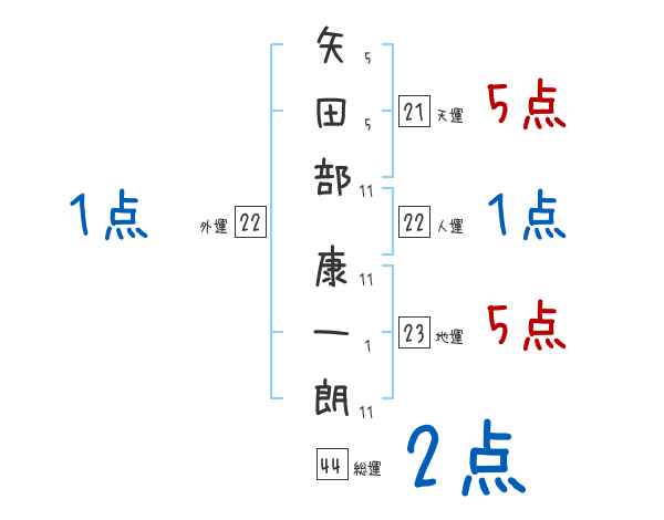 総運![]() | 矢田部康一朗さんの総運は44画の2つ星!誠実で慎重な性格。物事を考えすぎないように注意しましょう。 あなたの人生を表す1番重要な運勢です。生涯を通じて影響する総合運となり、主に50歳以降の晩年期に影響を及ぼします。 |