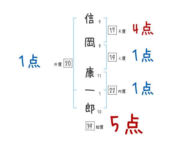 天運![]() | 信岡康一郎さんの天運は17画の4つ星!積極的な行動力。地位を気づき財産を手に入れる。純粋な心と直感力。 家系が持つ宿命的な運勢を表します。祖先から受け継いだ苗字ですので自分の力が及びません。家柄を象徴します。 |