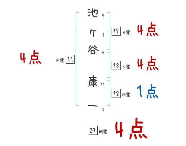 天運![]() | 池ヶ谷康一さんの天運は17画の4つ星!積極的な行動力。地位を気づき財産を手に入れる。純粋な心と直感力。 家系が持つ宿命的な運勢を表します。祖先から受け継いだ苗字ですので自分の力が及びません。家柄を象徴します。 |