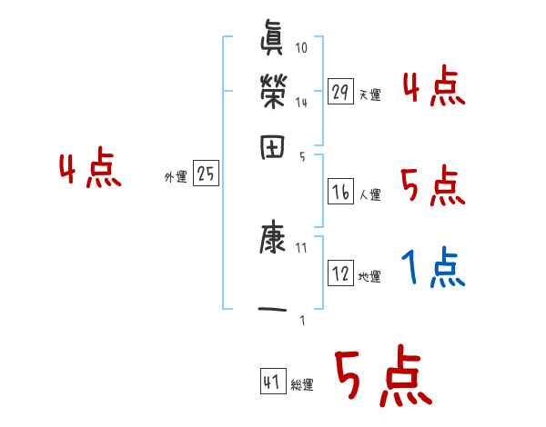 人運![]() | 眞榮田康一さんの人運は16画の5つ星!人望が厚く大きく発展する。逆転成功が見える。 性格や才能などを表す2番目に重要な運勢です。人間関係や協調性、社会的な成功に影響します。主に20歳から50歳ぐらいまでの中年期の運勢を表します。 |