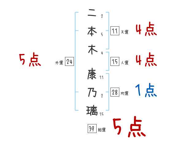 天運![]() | 二本木康乃璃さんの天運は11画の4つ星!着実に富や地位を得る幸運な人生。 家系が持つ宿命的な運勢を表します。祖先から受け継いだ苗字ですので自分の力が及びません。家柄を象徴します。 |