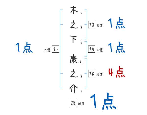 総運![]() | 木之下康之介さんの総運は28画の1つ星!家庭環境に注意。スポーツで活躍できる能力があるかも。 あなたの人生を表す1番重要な運勢です。生涯を通じて影響する総合運となり、主に50歳以降の晩年期に影響を及ぼします。 |